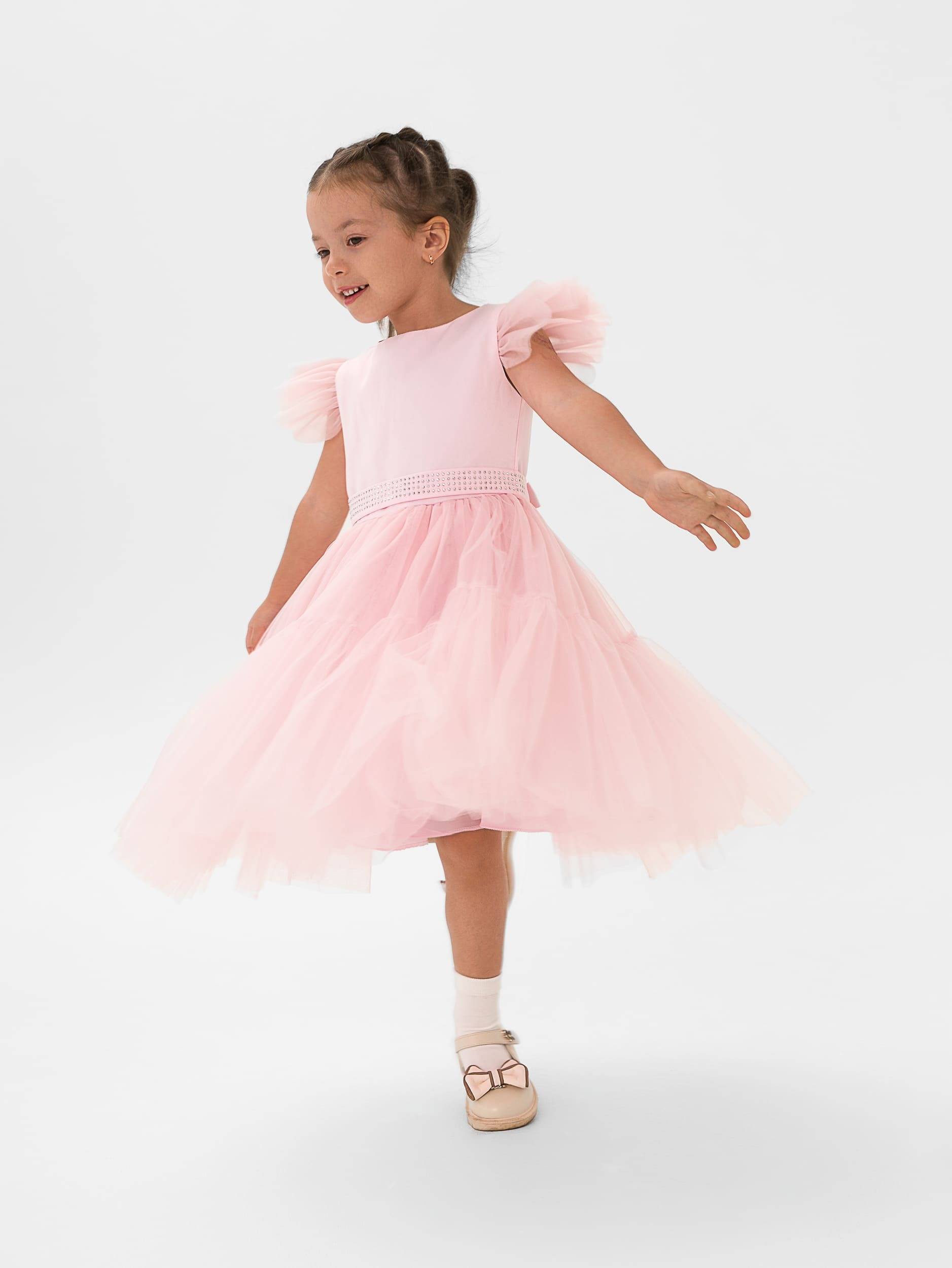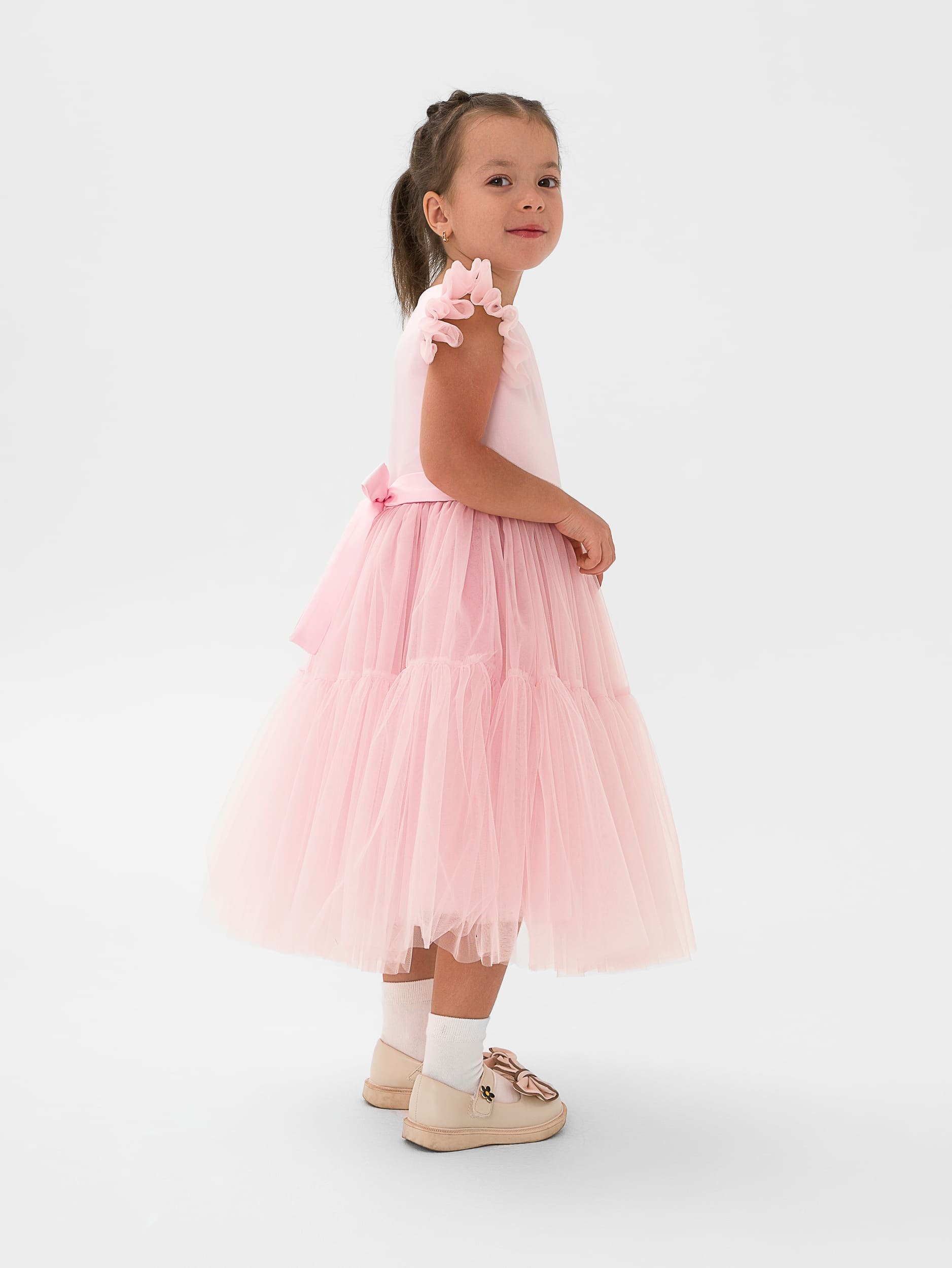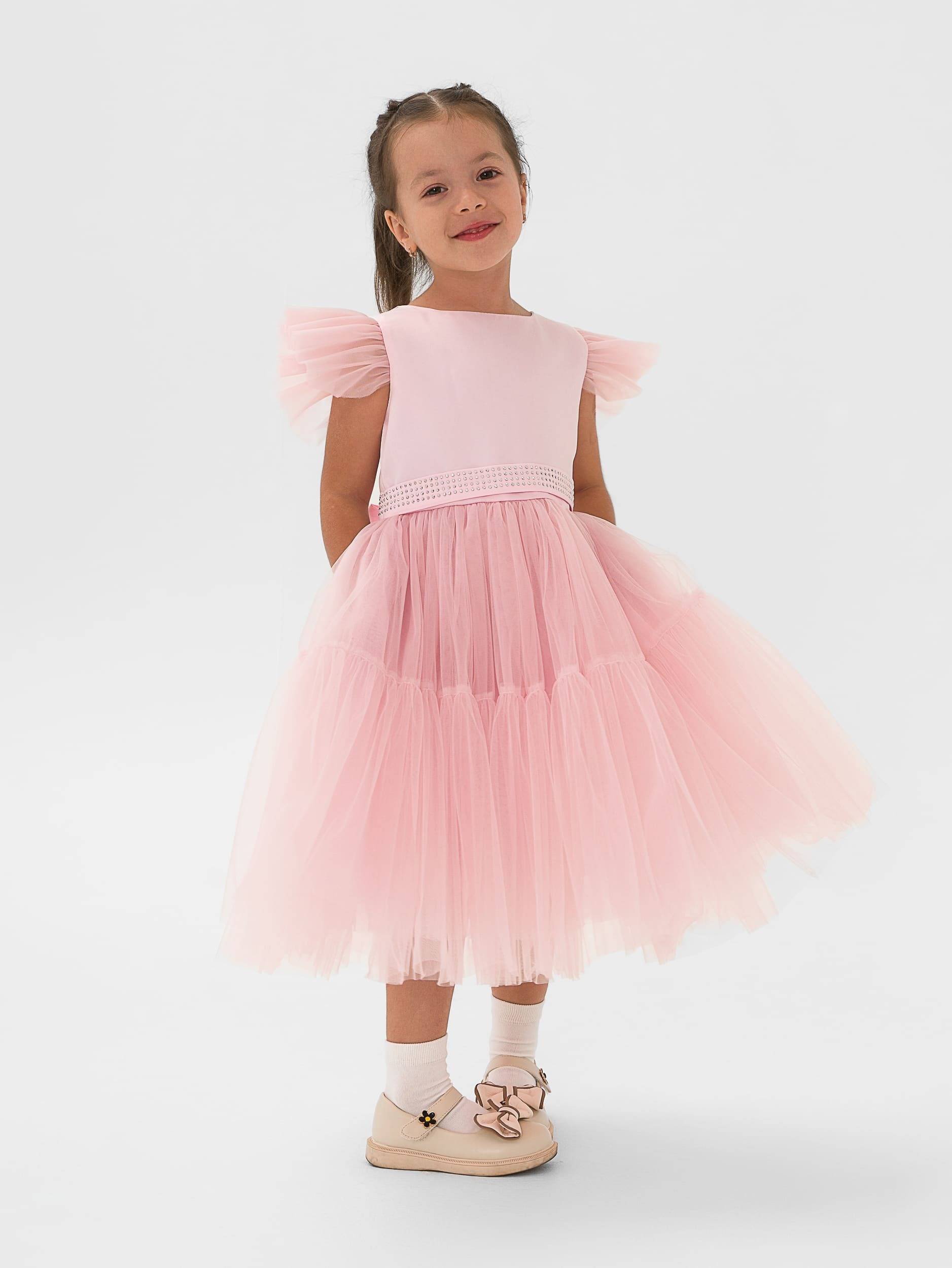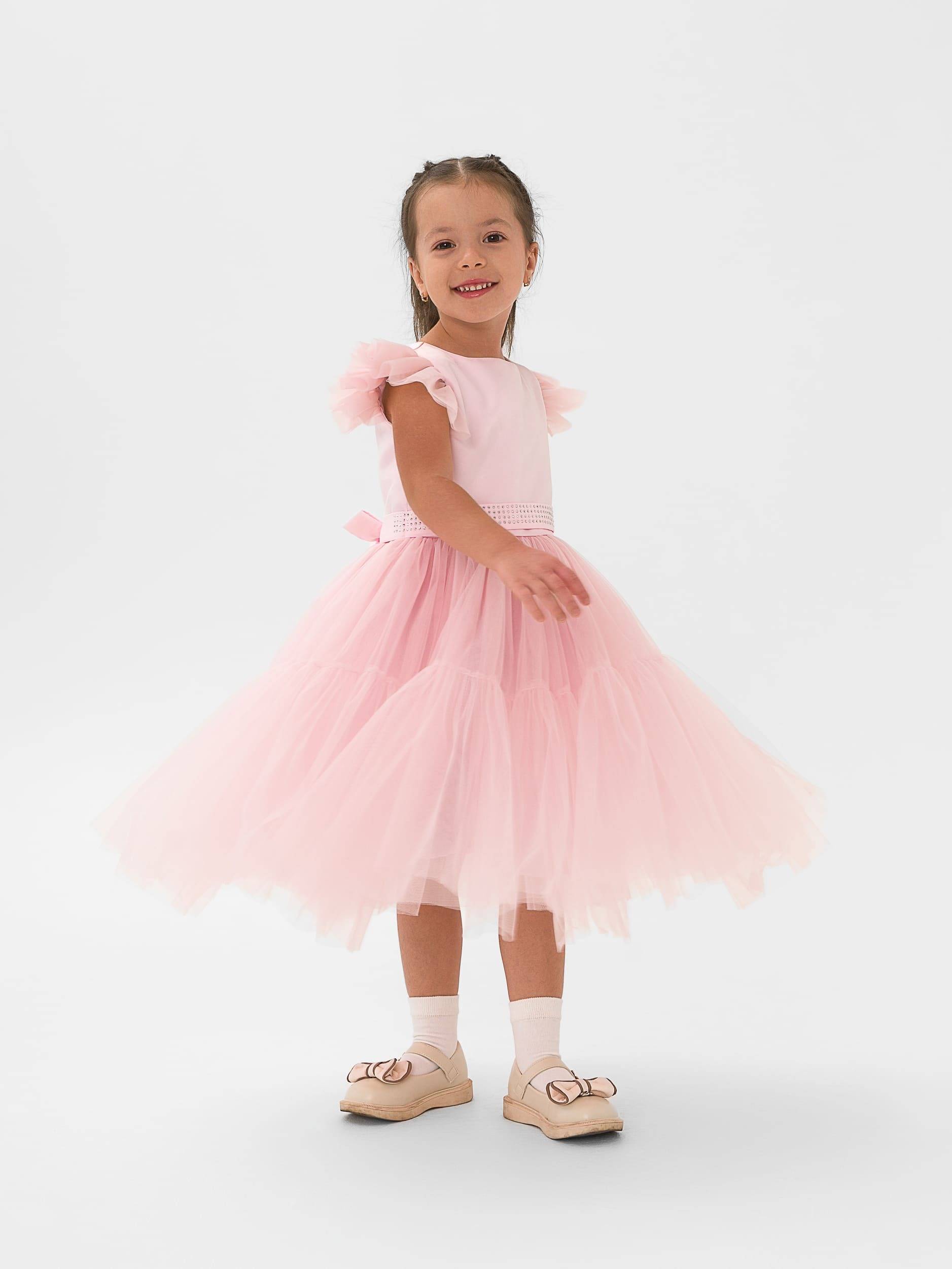 Платье детское полуприлегающего силуэта из костюмной ткани и фатина. Платье отрезное по талии с подкладом по верху и юбки. Обработка низа изделия юбкой солнце со сборкой , имеется отдельный пояс из основной ткани верха. Платье без рукавов с крылышками по верху проймы. Молния в шве разрезной спинки.