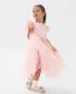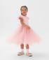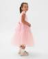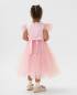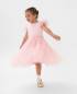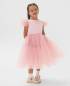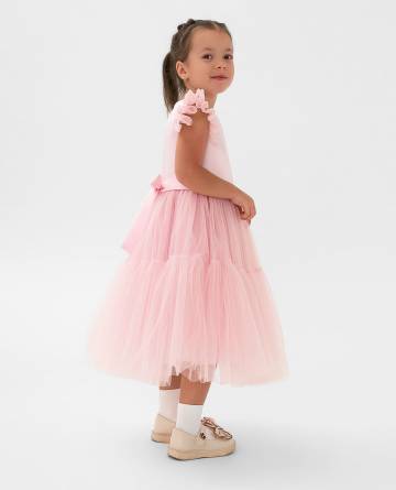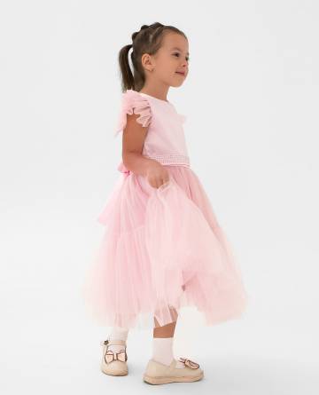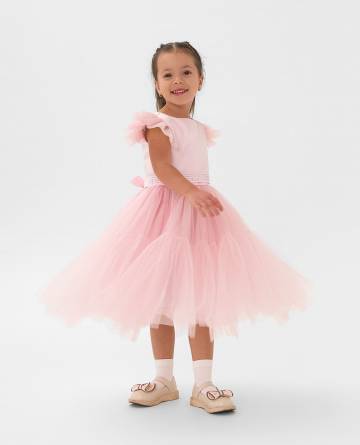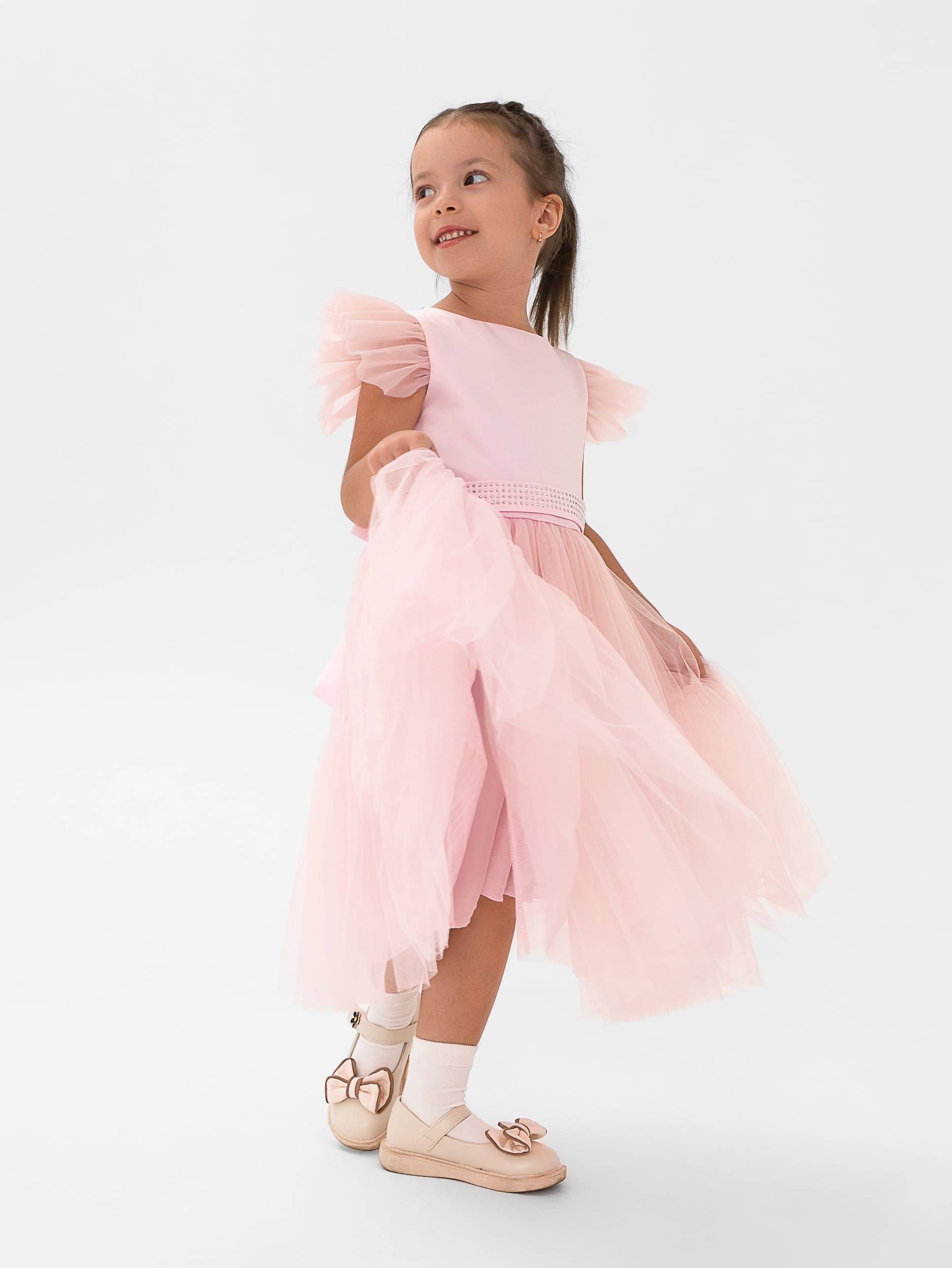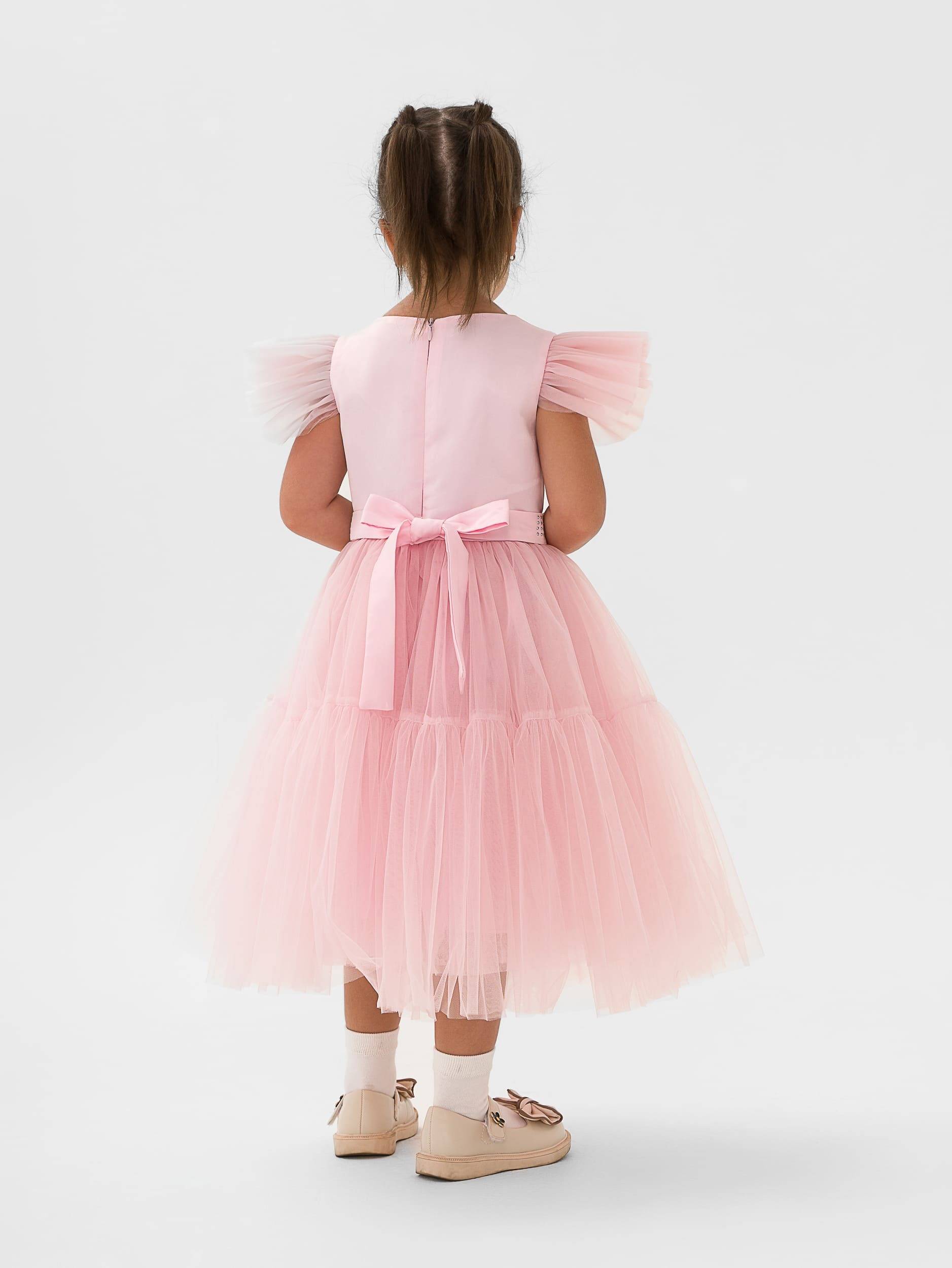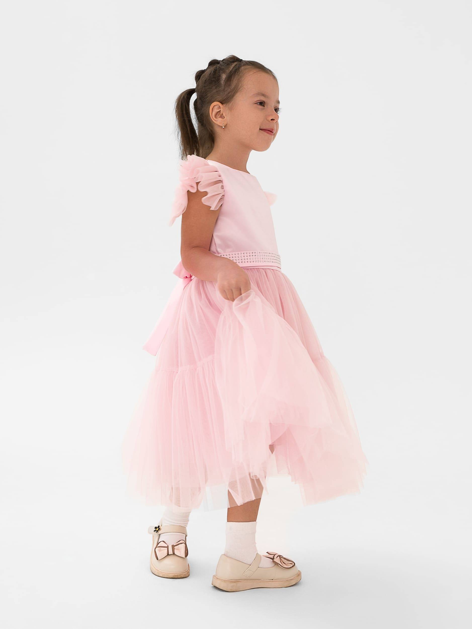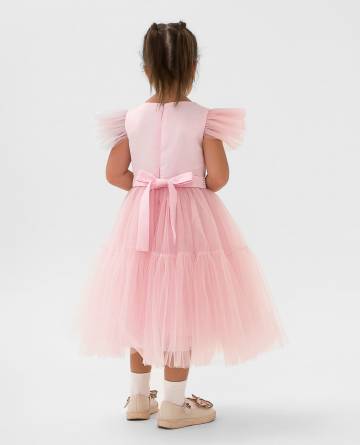 Платье детское полуприлегающего силуэта из костюмной ткани и фатина. Платье отрезное по талии с подкладом по верху и юбки. Обработка низа изделия юбкой солнце со сборкой , имеется отдельный пояс из основной ткани верха. Платье без рукавов с крылышками по верху проймы. Молния в шве разрезной спинки.