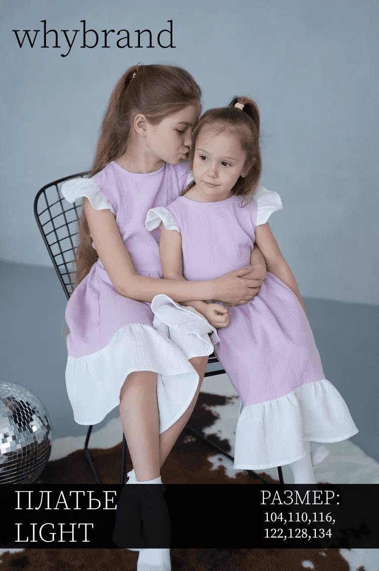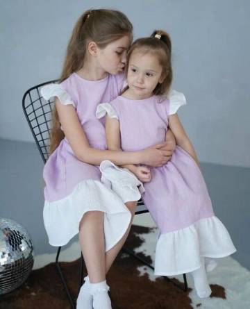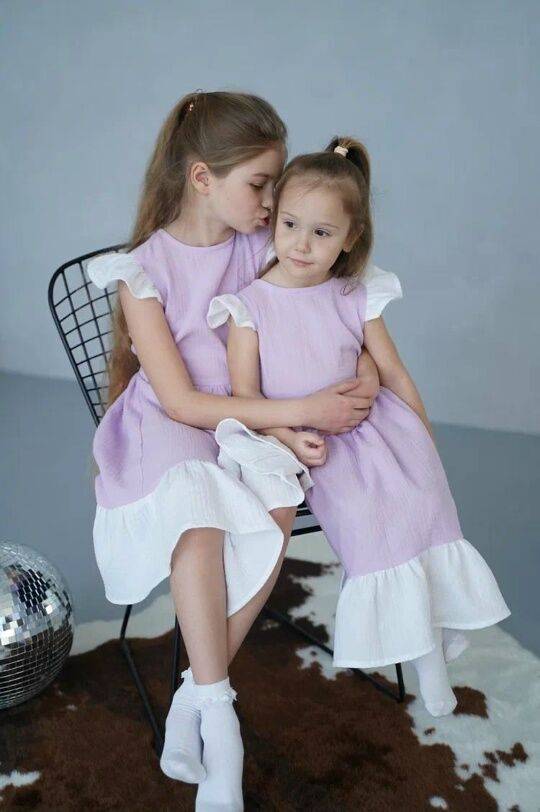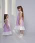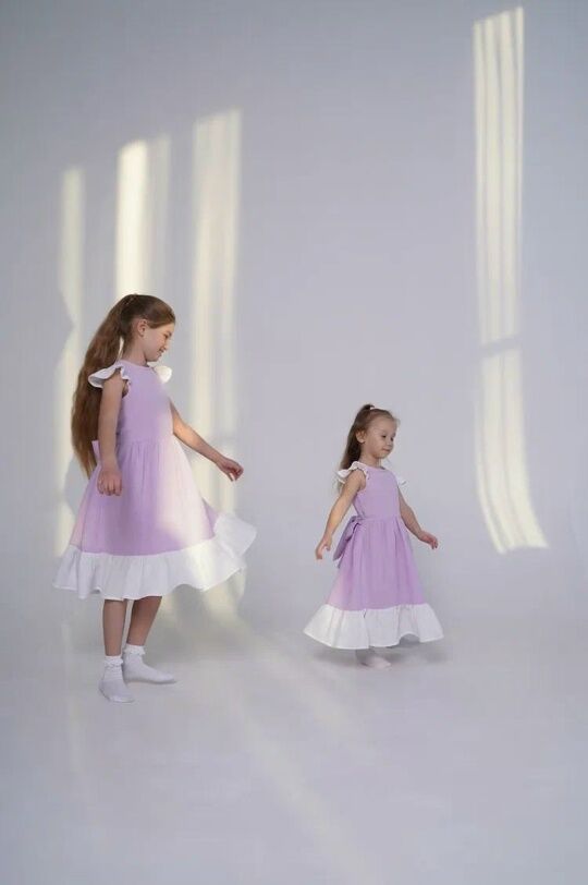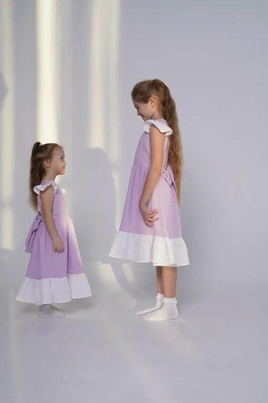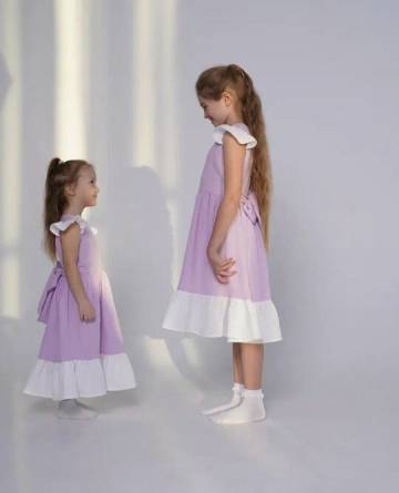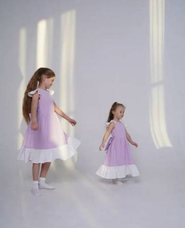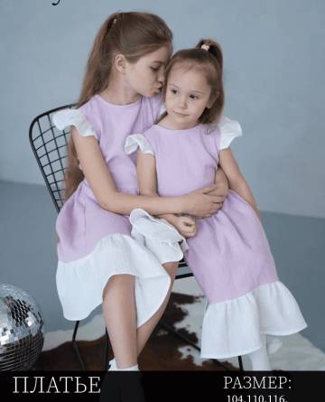 Детское платье-сарафан свободного силуэта ниже колена. Плечо укорочено, по окату втачано крылышко на сборке. Платье отрезное по линии талии, юбка состоит из двух частей - верхней части и нижнего волана на сборке. Горловина окантована бейкой, ширина на входе 3 см. Застежка на спинке на цельновыкроенную планку. В боковые швы вставляется вытачной пояс. Рекомендуемые материалы: муслин, батист, легкий рубашечный хлопок.