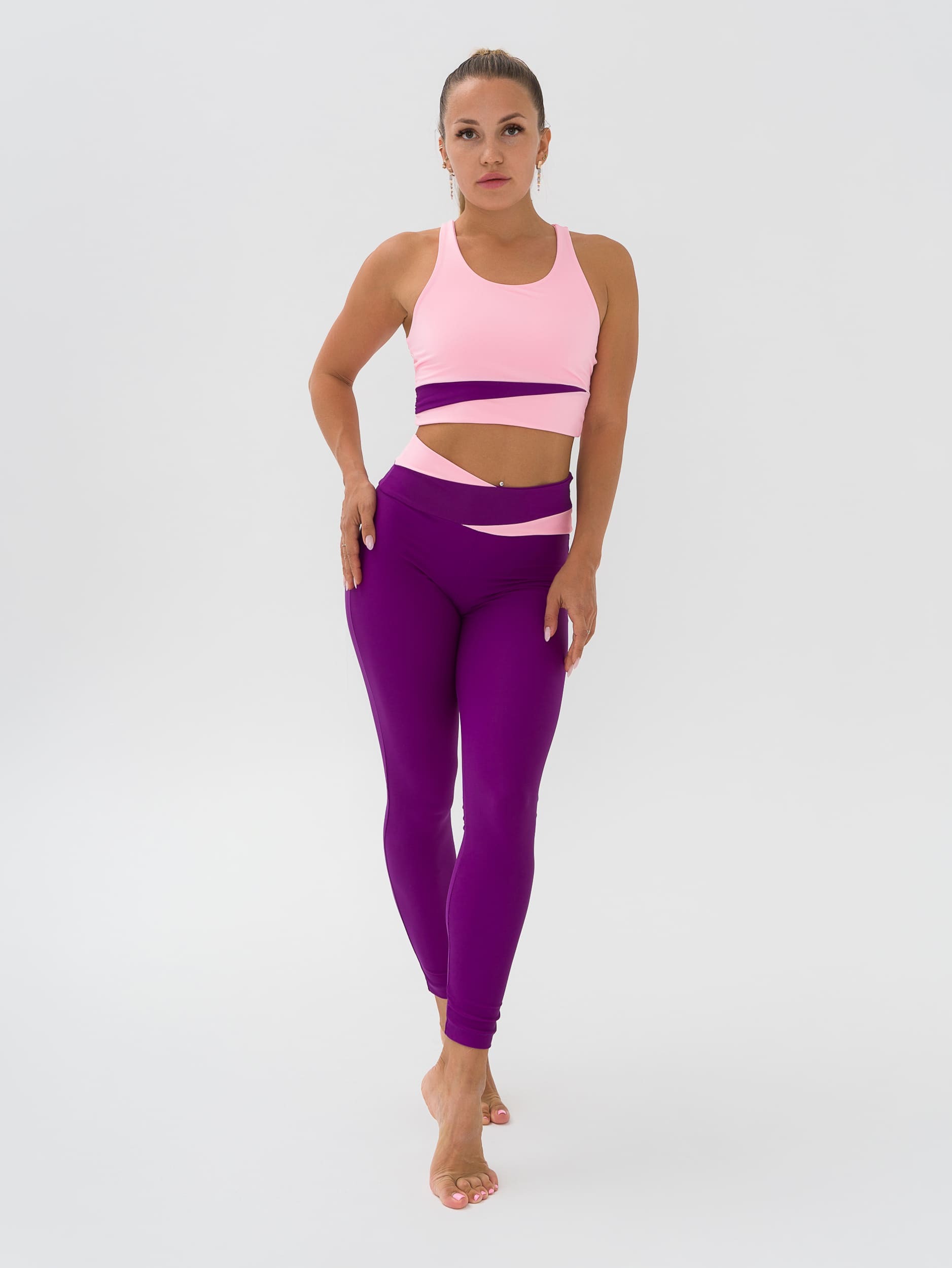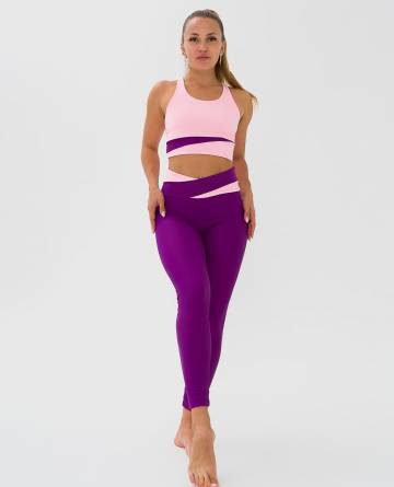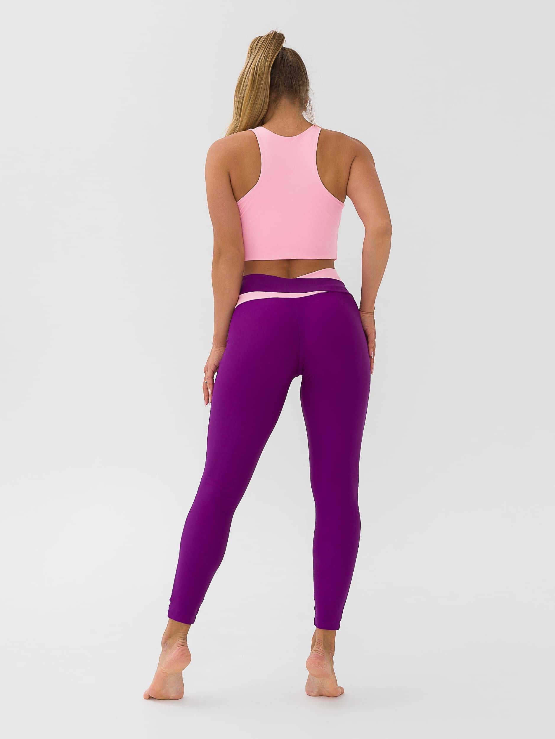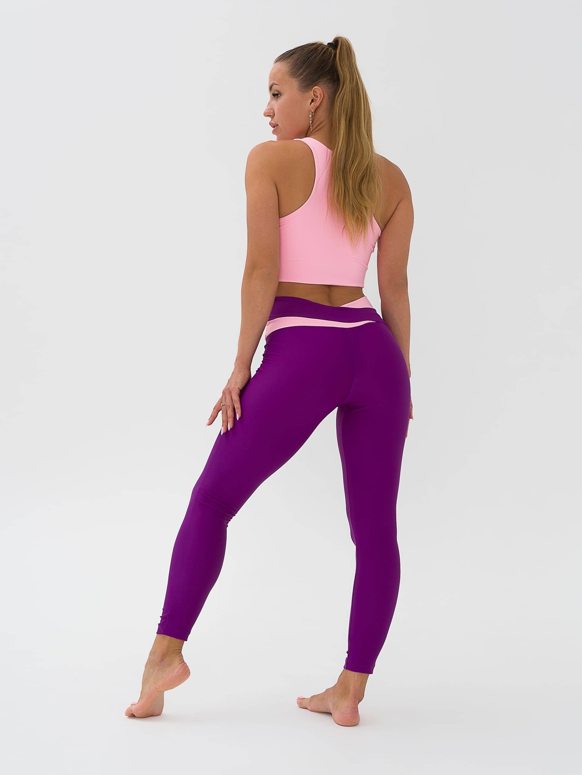 Легинсы для фитнеса из эластичной ткани с боковым швом, полностью повторяют форму ног, широкие отрезной пояс с асимметричными вставками из отделочной ткани. Посадка на талии, спереди чуть занижена