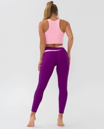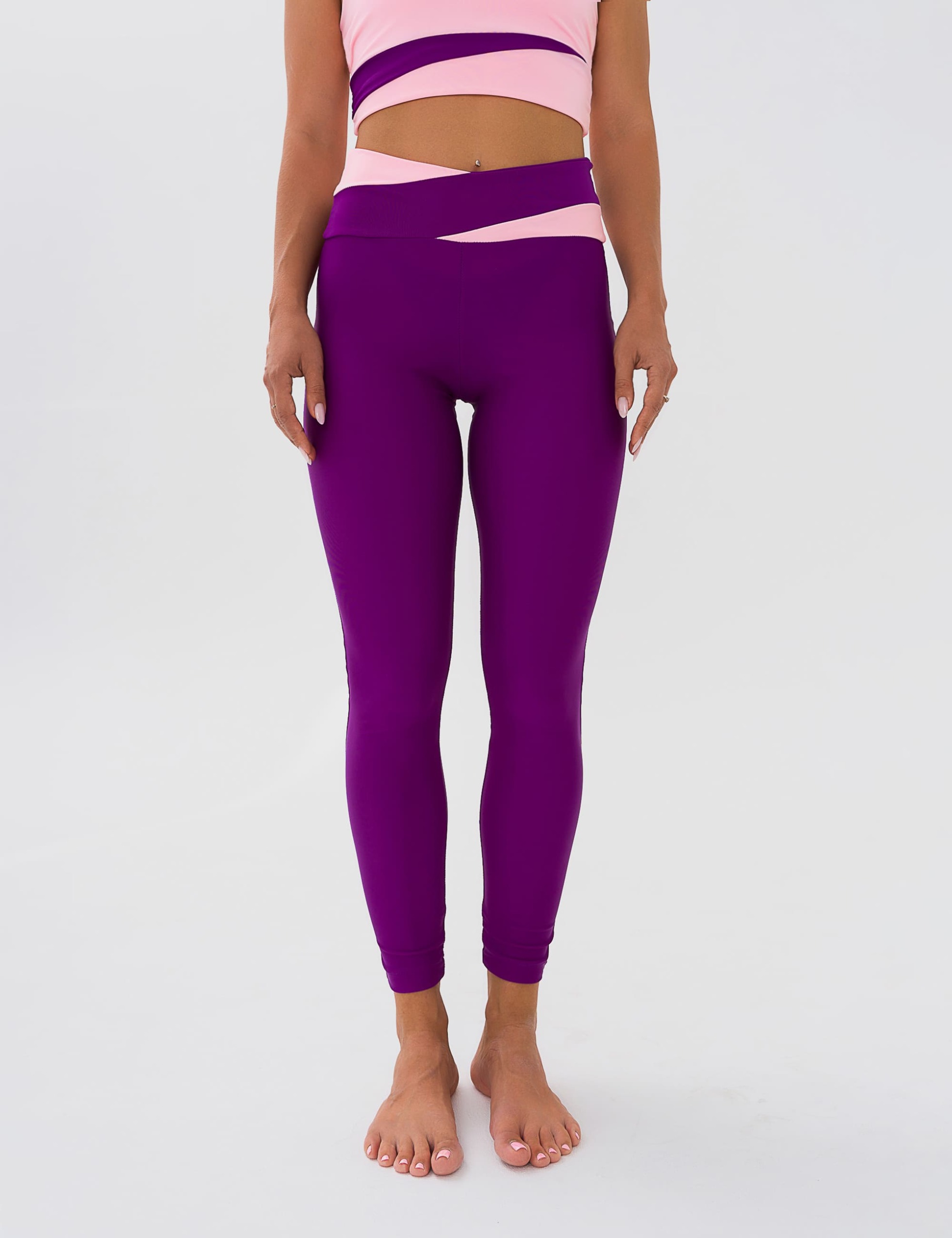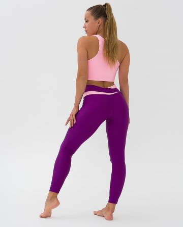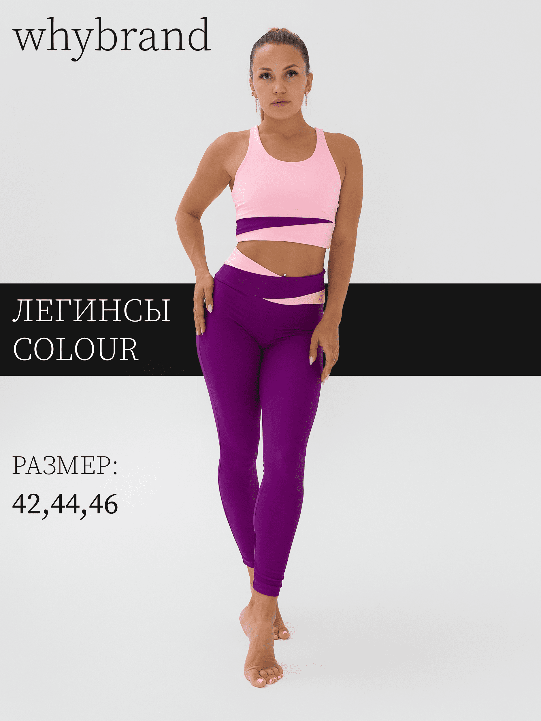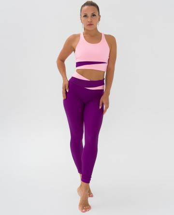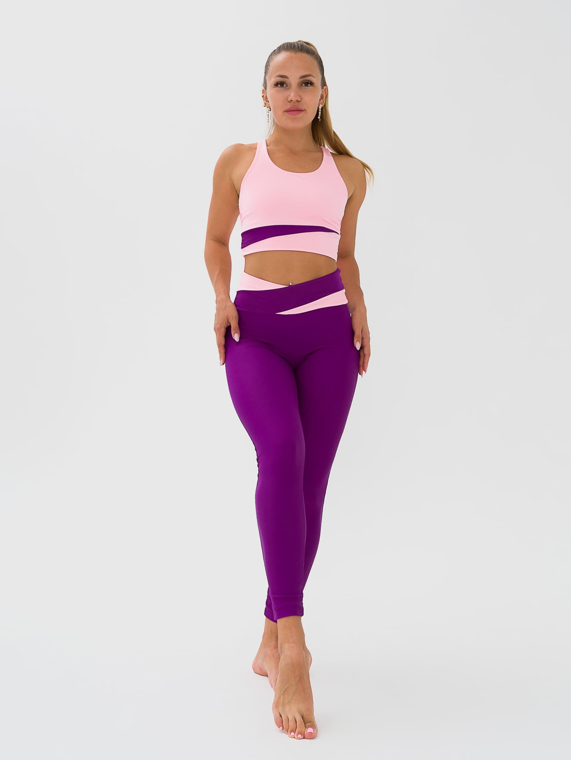 Легинсы для фитнеса из эластичной ткани с боковым швом, полностью повторяют форму ног, широкие отрезной пояс с асимметричными вставками из отделочной ткани. Посадка на талии, спереди чуть занижена