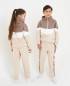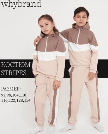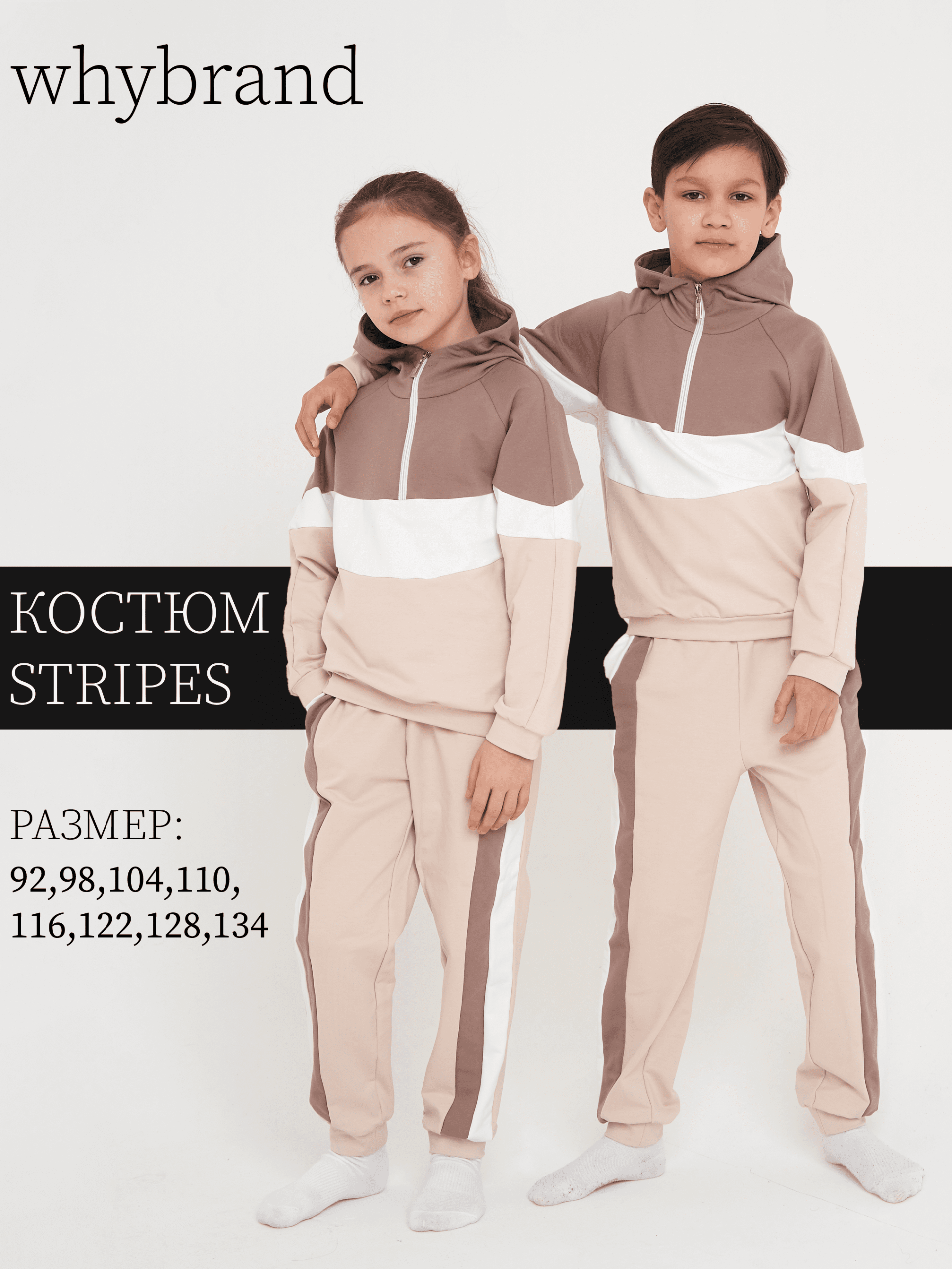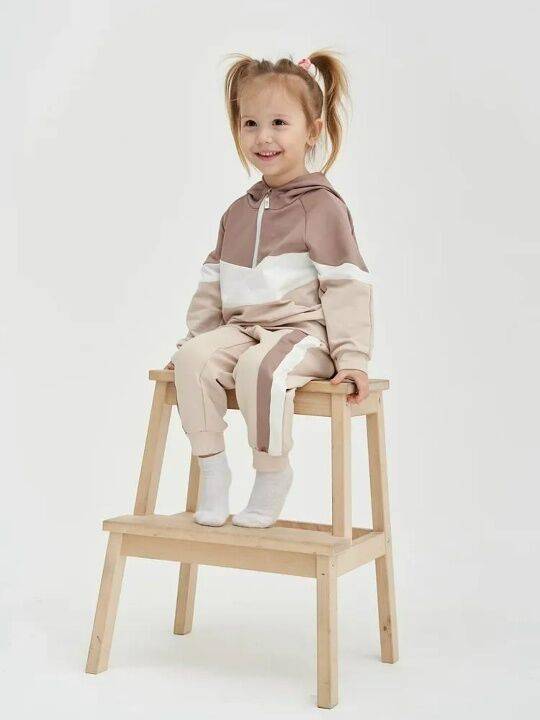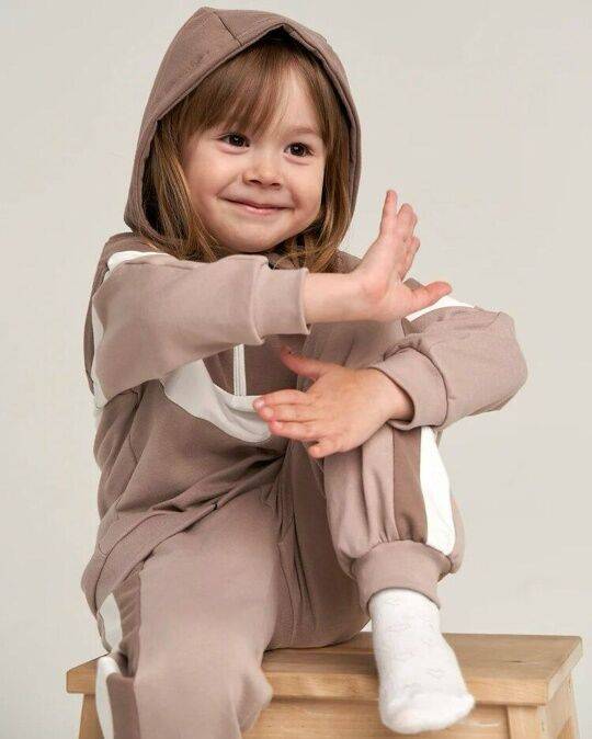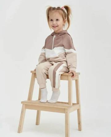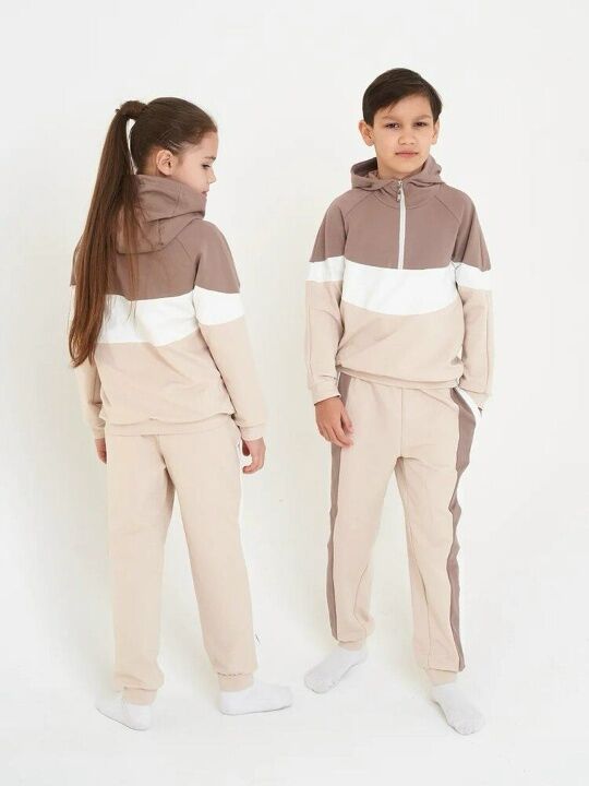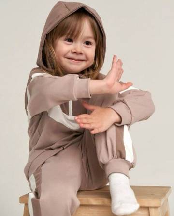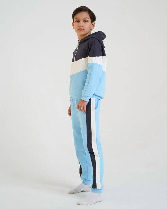 Костюм спортивный детский. Толстовка на молнии, начинающейся от низа груди и уходящей в стойку капюшона. Капюшон в один слой. Рукав реглан. Толстовка имеет три горизонтальных декоративных реза, по низу пояс из основной ткани. Брюки свободного силуэта с отрезным широким поясом с резинкой, по низу штанины обработаны манжетой из основной ткани. Карманы в боковых швах. Брюки имеют три декоративных вертикальных реза