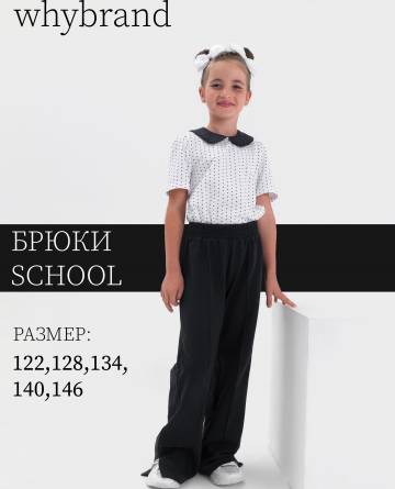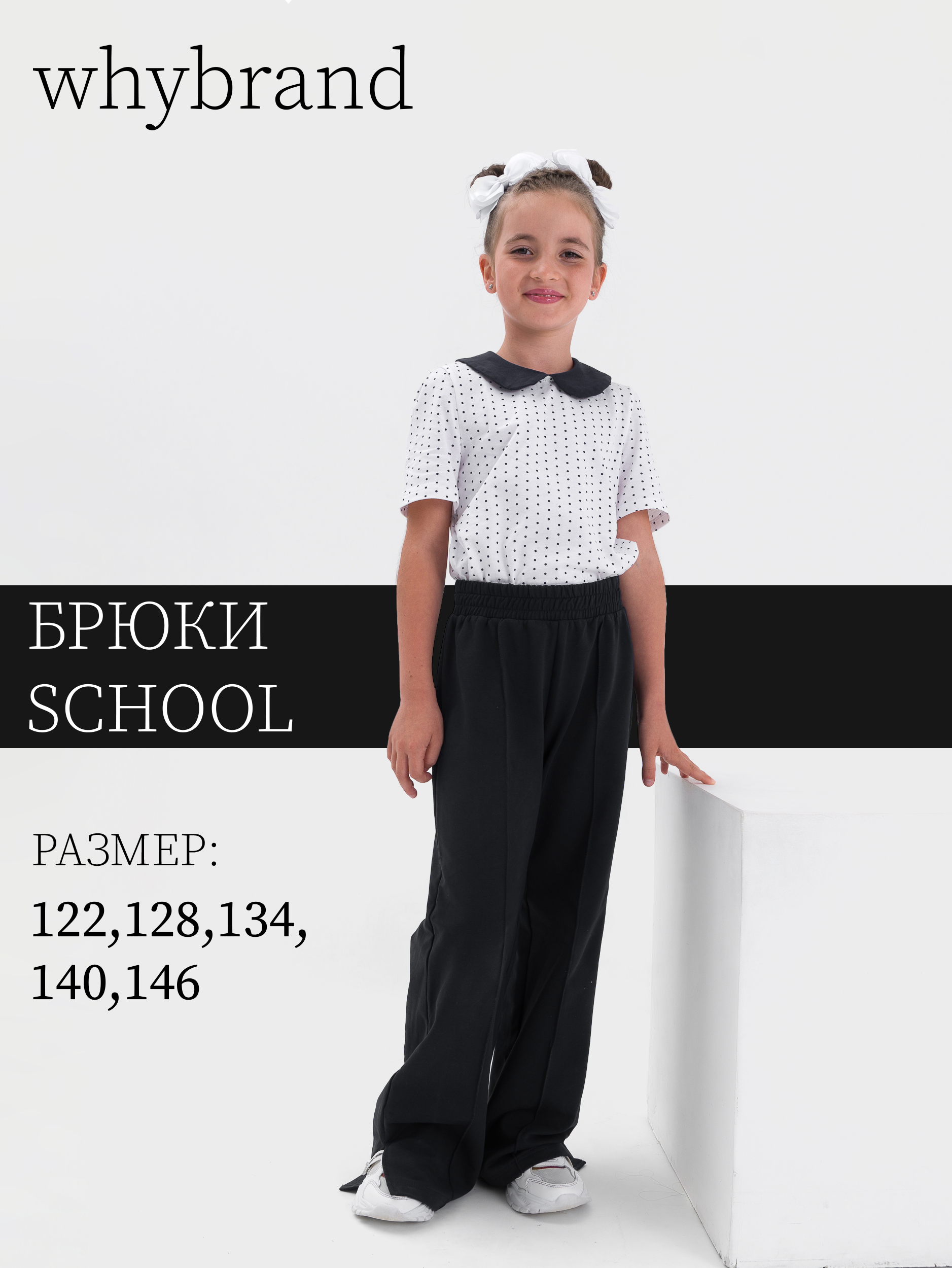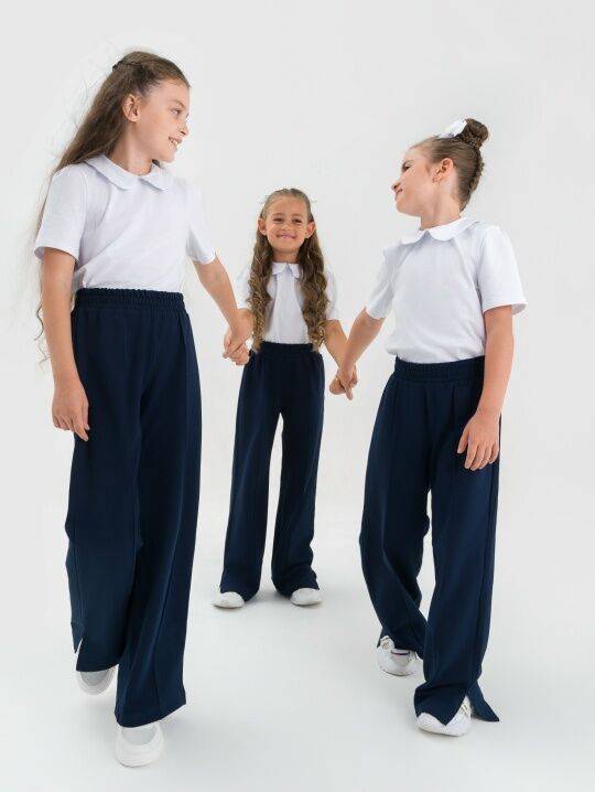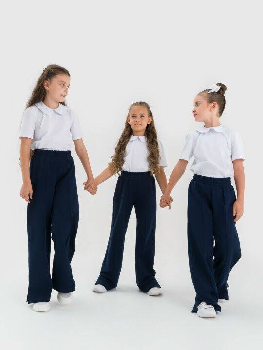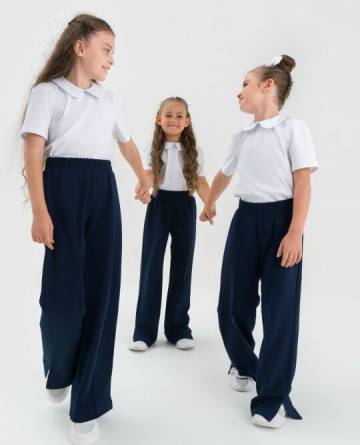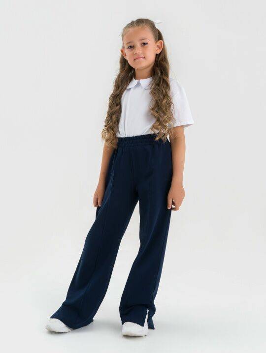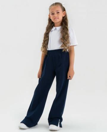 Брюки трикотажные для девочек, расклешенные от бедра штанины с защипом по передней части для формирования стрелки и небольшими разрезами по бокам. Без карманов. Идеально подходят для школы.