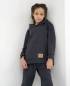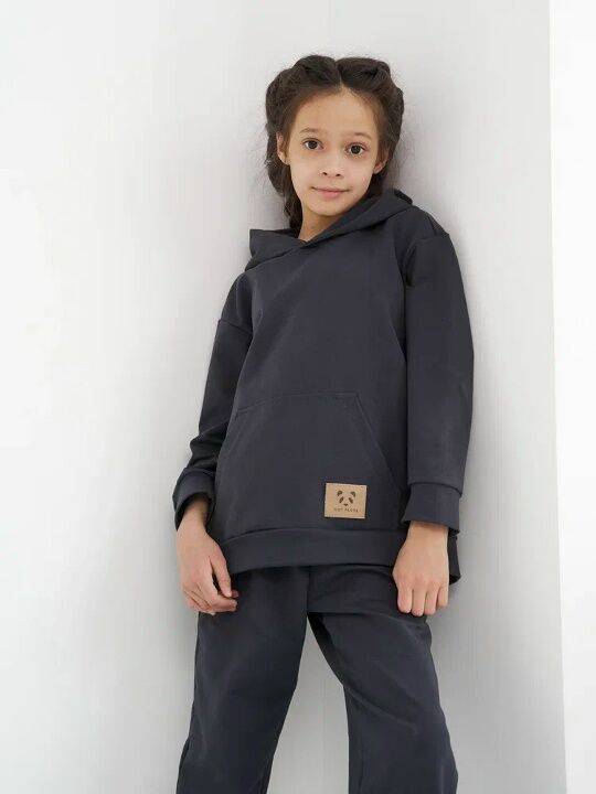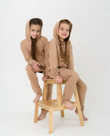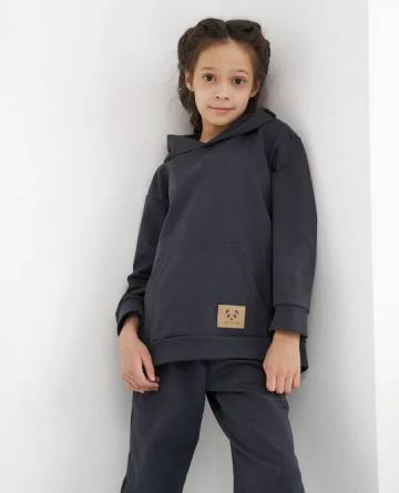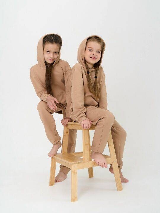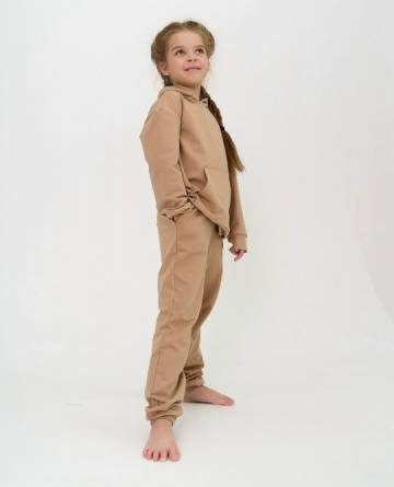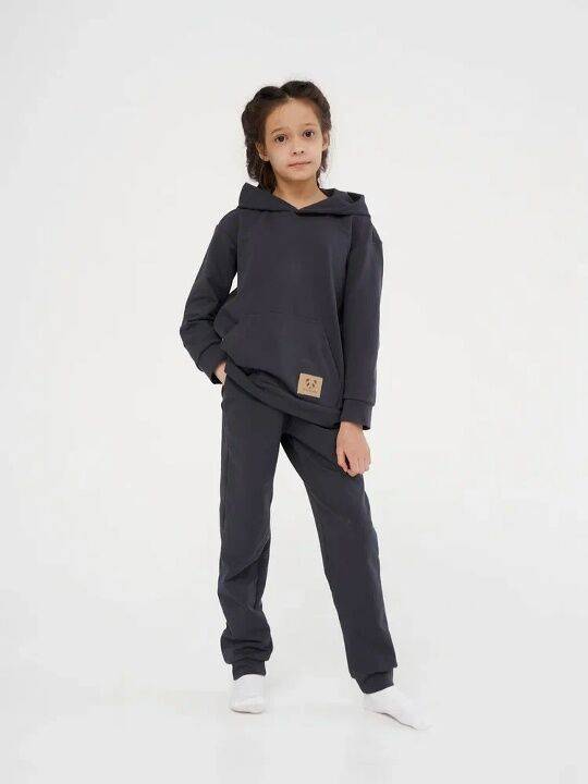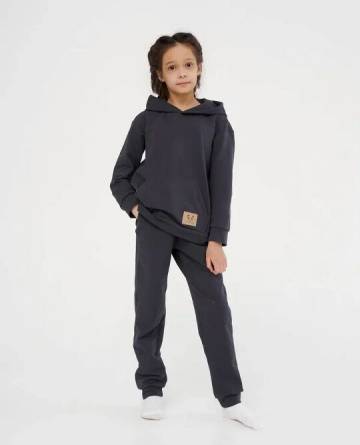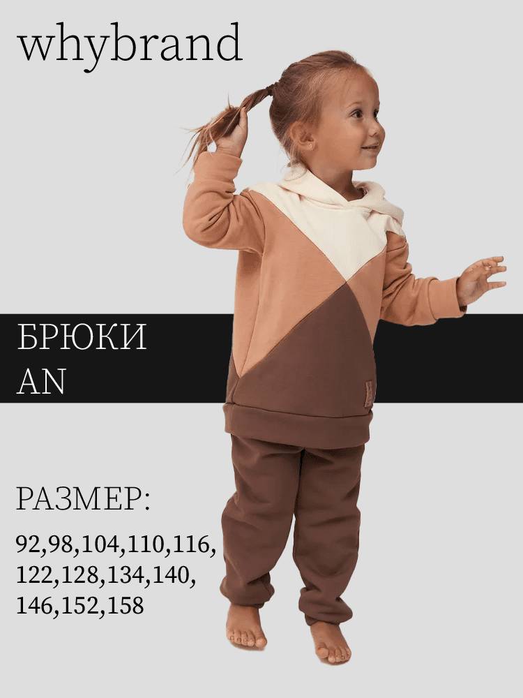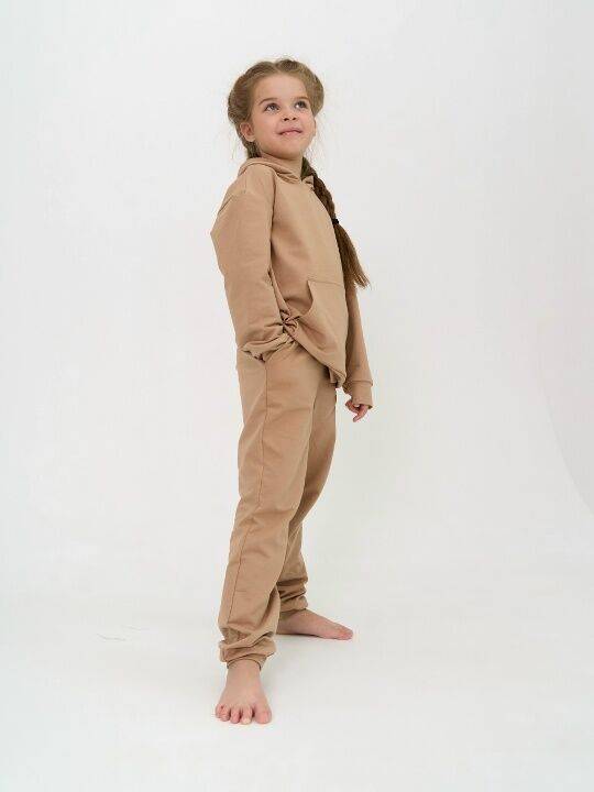 Брюки детские спортивные свободного силуэта из ткани футер с карманами в боковых швах с деталями мешковин. Детали передних и задних половинок брюк без дополнительной обработки, прямого покроя. По верху брюк предусмотрена обработка отрезного пояса из ткани кашкорсе или основной ткани. По низу брюк идёт обработка манжет из ткани так же по усмотрению.