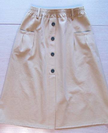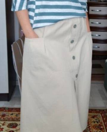 Удобная и стильная юбка, которая сочетает в себе классический вид и максимальный комфорт. Модель без застежки легко надевается благодаря поясу на резинке. Декоративная планка с пуговицами спереди создает вид традиционной застежки, а разрез обеспечивает свободу движения.