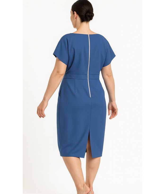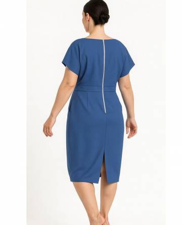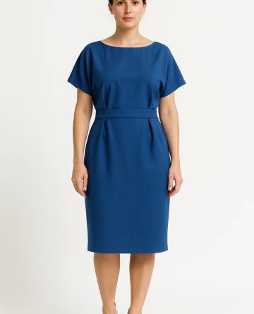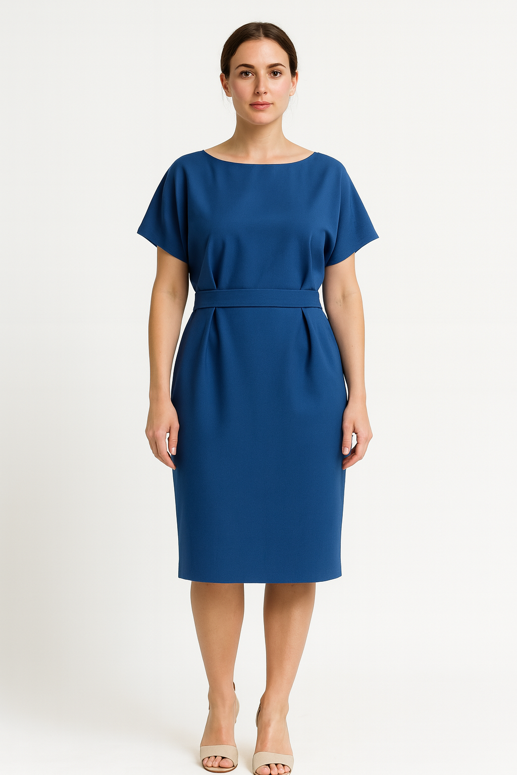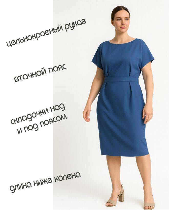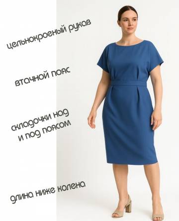 Элегантное платье полуприлегающего силуэта, которое искусно подчеркивает фигуру. Цельнокроеный рукав обеспечивает комфорт и создает мягкую линию плеча, а втачной пояс акцентирует талию. Мягкие складочки над и под поясом придают свободу в области живота и бедер, создавая женственный силуэт.