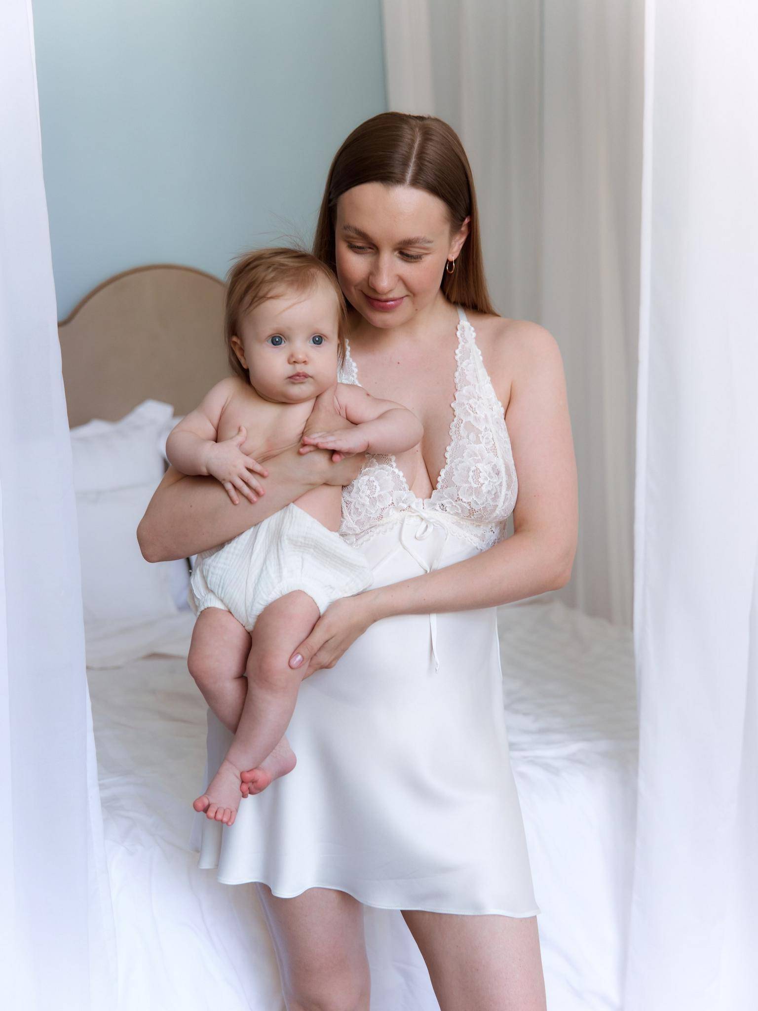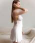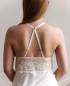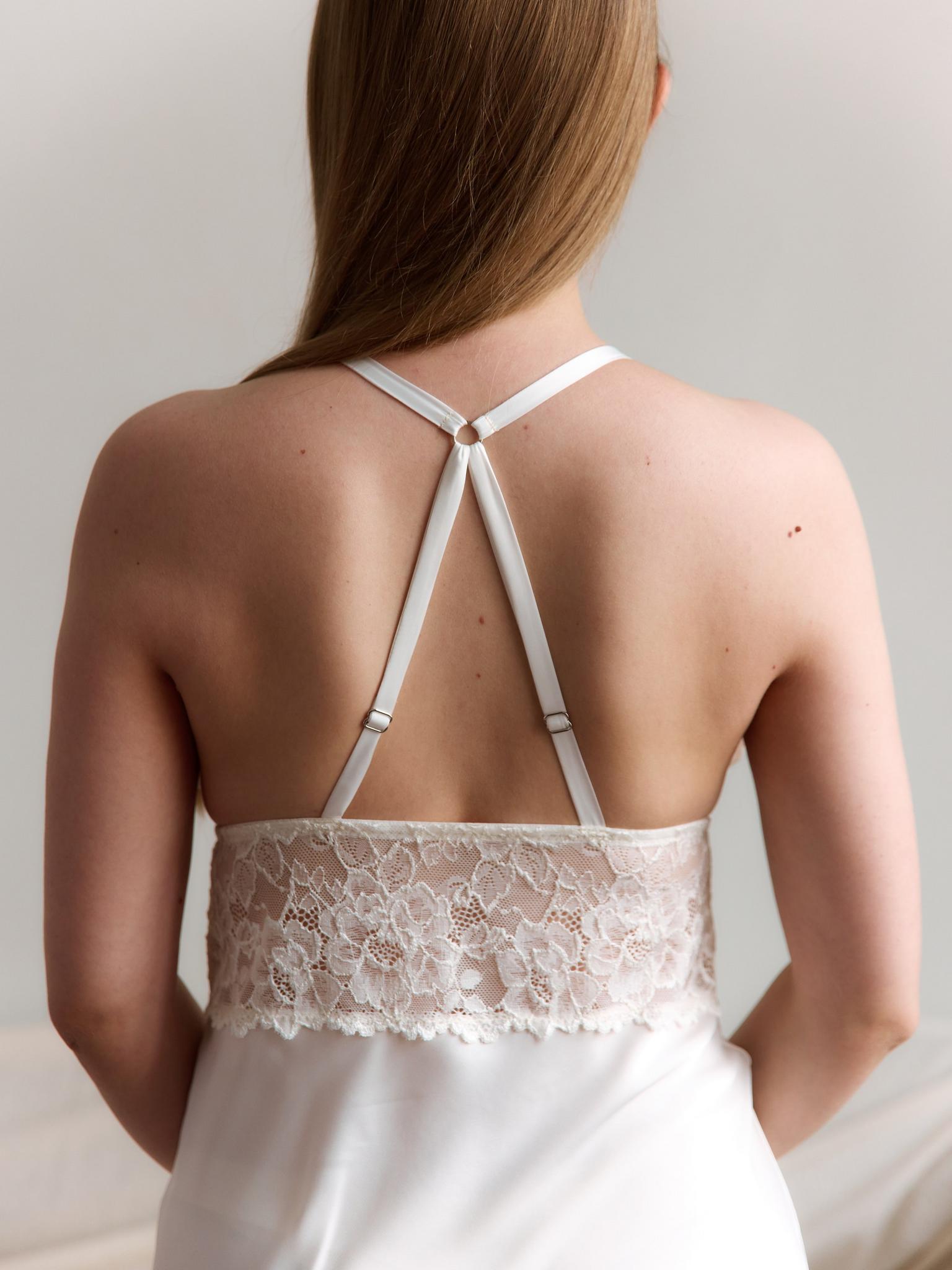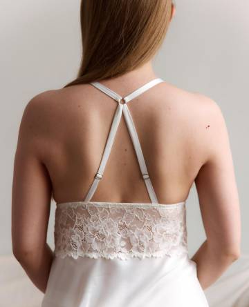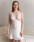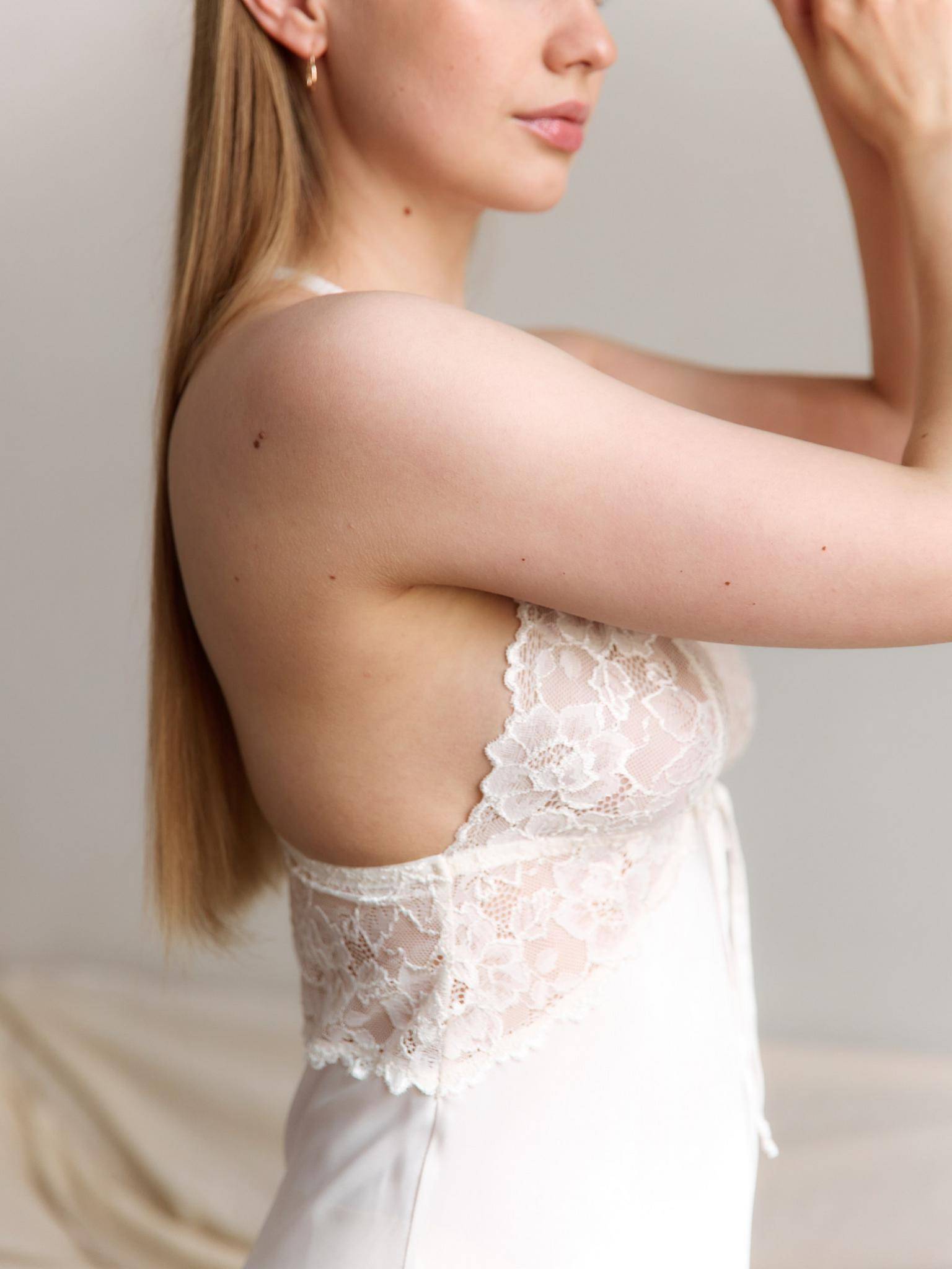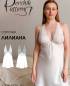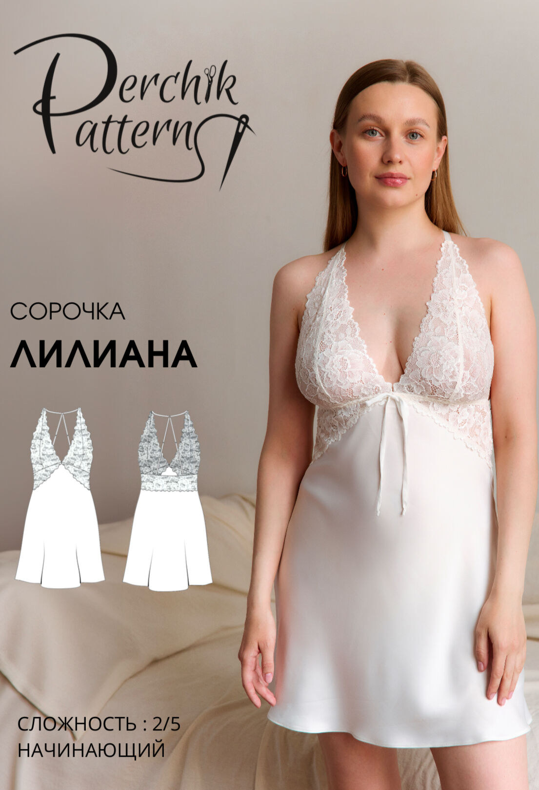 Выкройка сорочки малого объема полуприлегающего силуэта длиной чуть выше середины бедра. Сорочка имеет отрезной лиф из эластичного кружева , удлиненные треугольные чашки . По краям чашек лифа идет свободный край фестона. Под грудью и по заднему срезу спинки обработка отделочной резинкой без фестона. На юбке по переду и спинки вставки из эластичного кружева. От чашки лифа отходят две бретели и крепятся к бельевому кольцу за шеей, также к кольцу прикреплены две бретели на регуляции , отходящие от верхней части детали спинки.